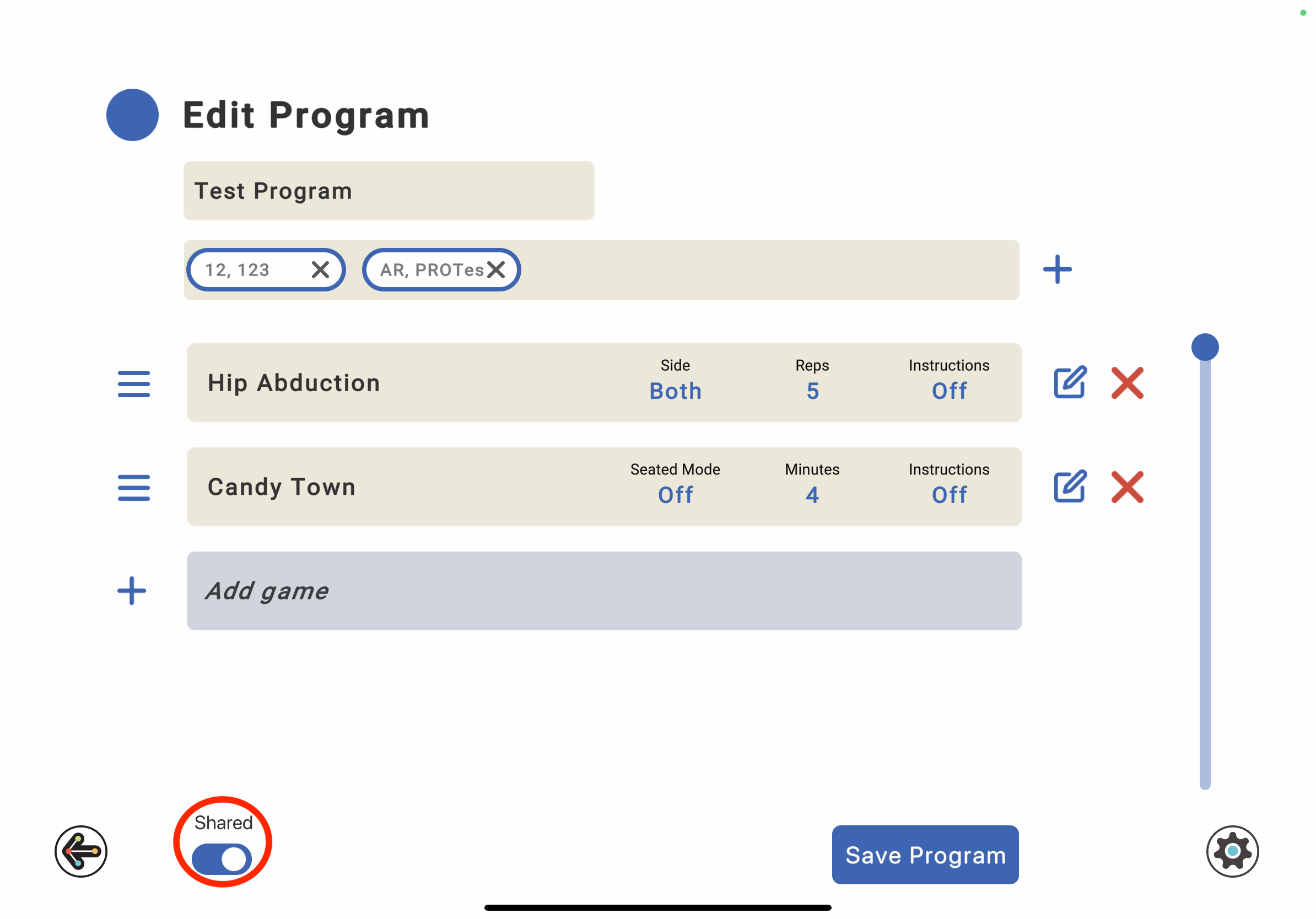4. Make any changes (adding patients, changing games, changing parameters of the games) and press "Save Program".