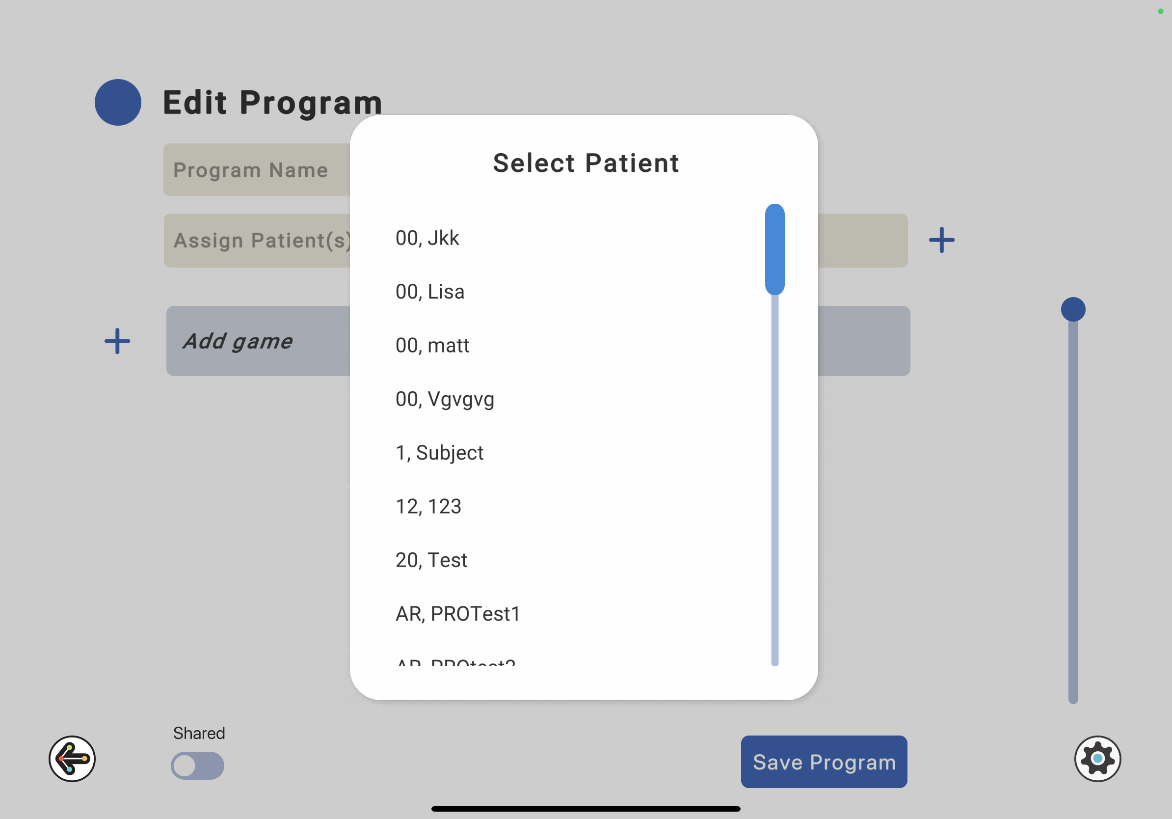 6. Tap on the name of the patient you want to add. This will make the program available to them if they log in with their patient account at home or while doing an in-person session with their therapist.